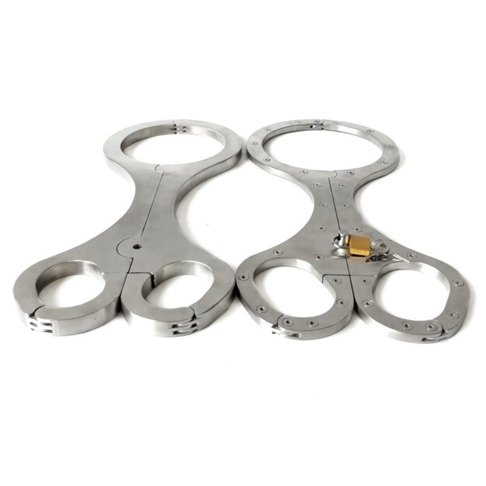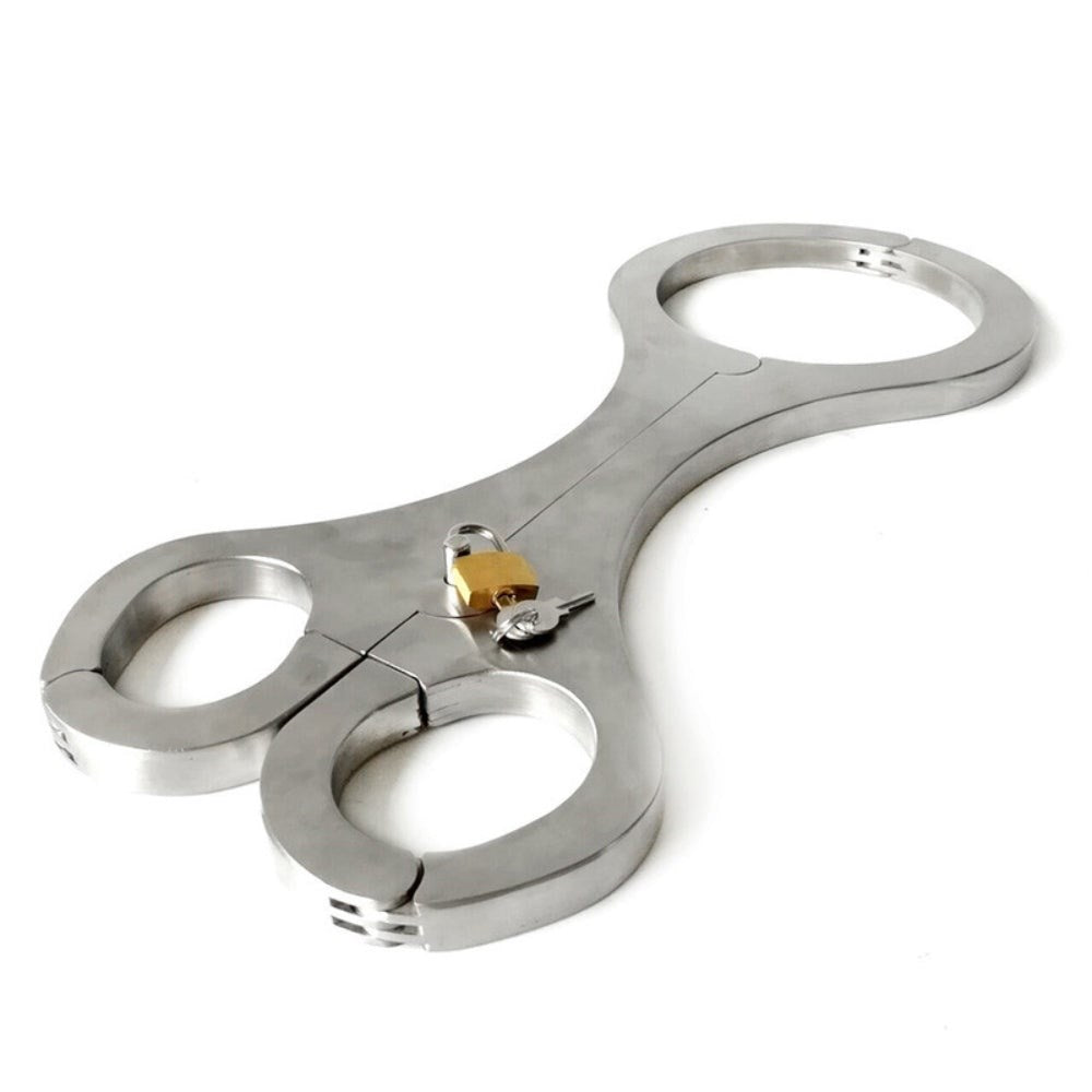 Anodized aluminum cangue bondage restraint locking wrists and neck in synchronized control. Professional-grade restraint for extended wear.