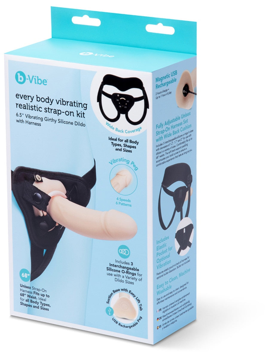 6.5" vibrating strap-on dildo with curved design for G-spot and prostate stimulation. Includes harness, three o-rings, and back support padding.