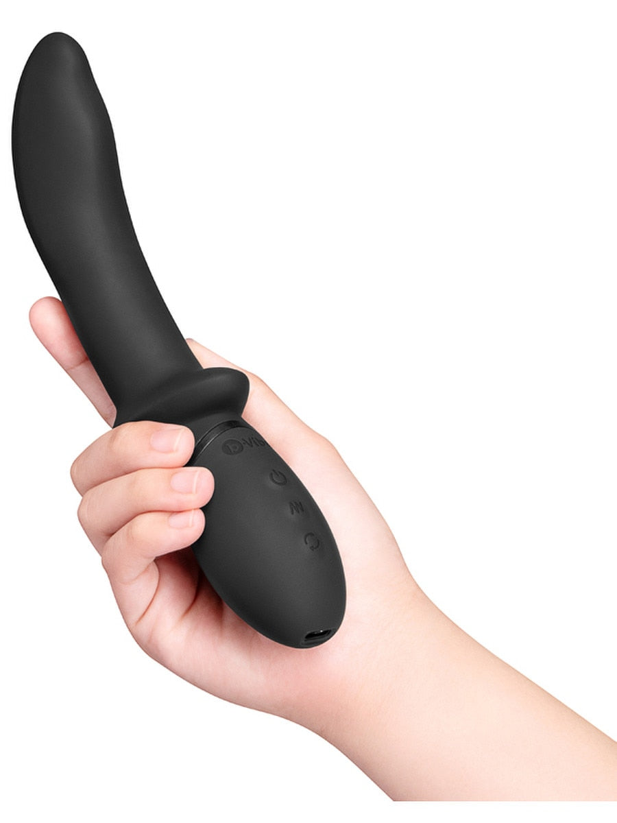 Triple stimulation prostate vibrator with rotating beads and vibrating tip. 5 speeds and patterns for intense P-spot massage with rimming sensation.