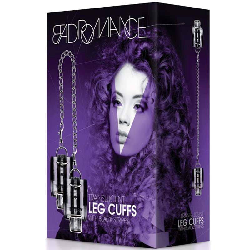 Translucent PVC leg cuffs with bold black stripes. Adjustable bondage restraints combining visibility and control for couples exploring restraint play.