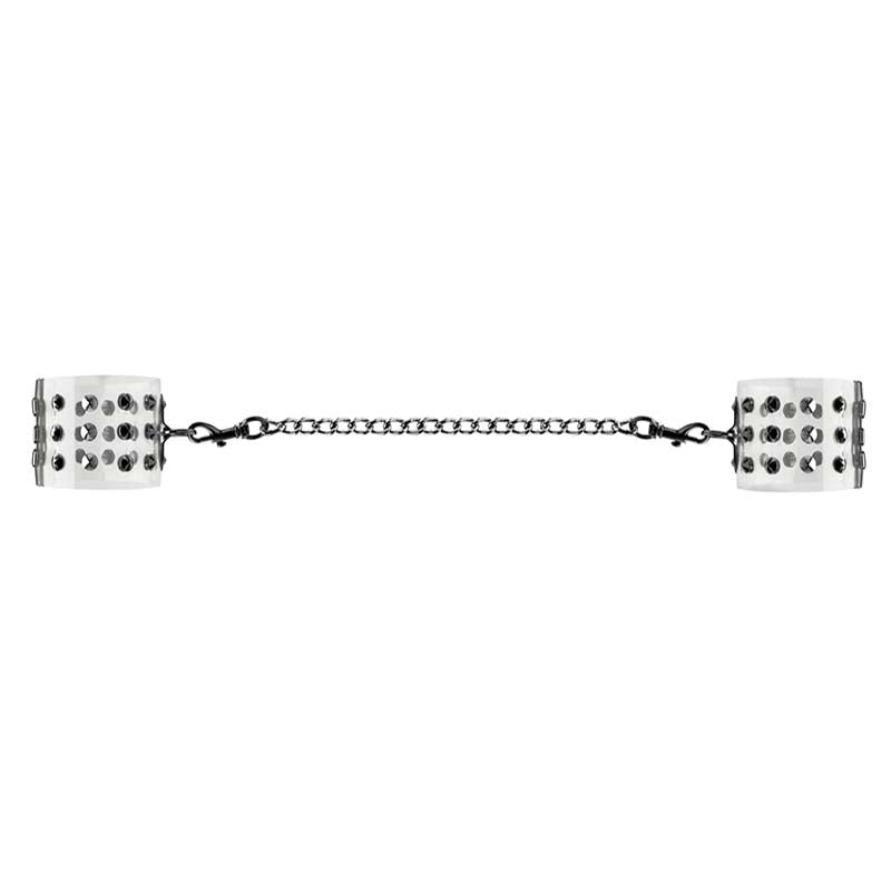 Shots Toys translucent leg cuffs with metal nail detailing. Adjustable PVC restraints connected by sturdy chain for bondage play.