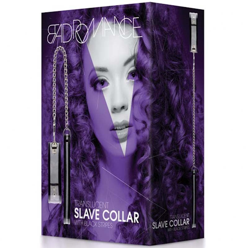 Translucent PVC slave collar with black stripes and metal buckle. Adjustable restraint collar for secure wear and striking visual impact.
