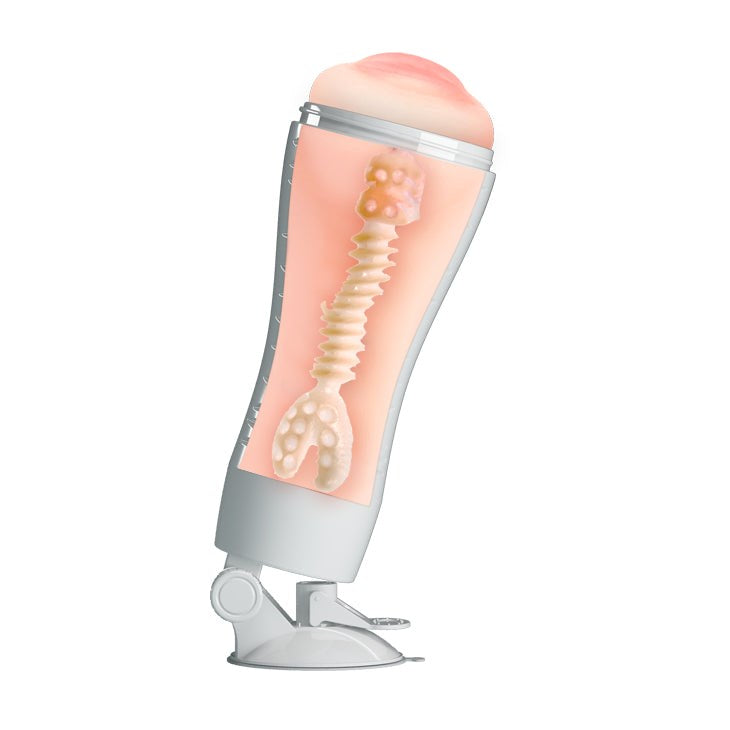 Realistic mouth stroker with TPR material and squeeze pad control. Suction cup base for hands-free use or mounted play.