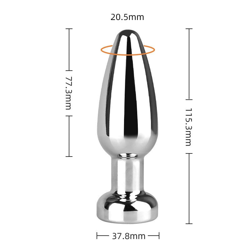 Metal vibrating butt plug with 10 settings and wireless remote control. Rechargeable battery for extended sessions.