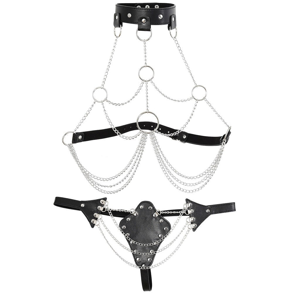 Black faux leather lingerie set with iron chain detailing. One size stretches to fit for couples exploring power dynamics and roleplay.