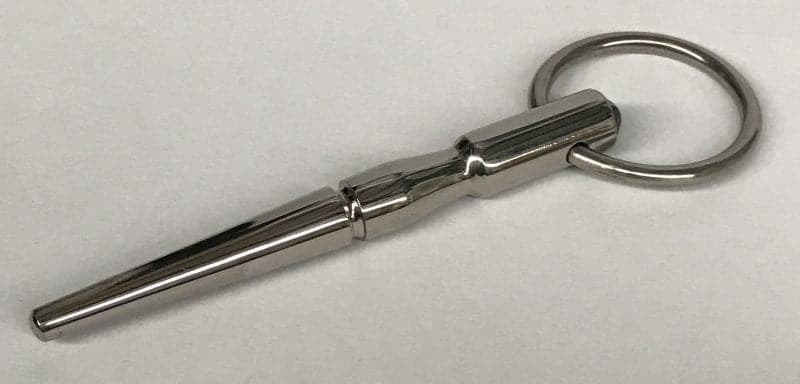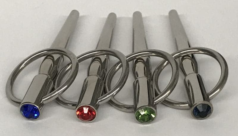 Stainless steel urethral plug with sparkling jeweled accents and adjustable base. Delivers cool, weighty sensations for intense steel play.