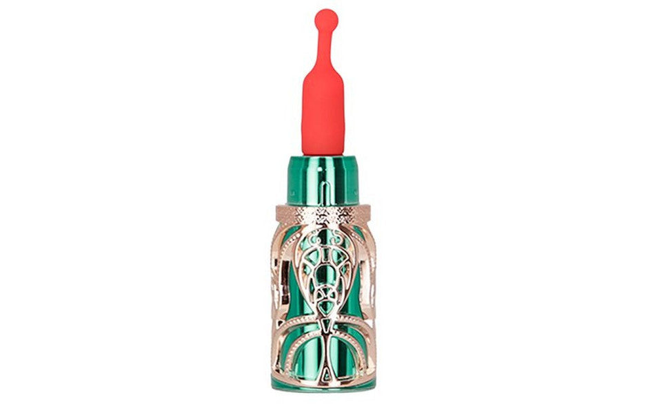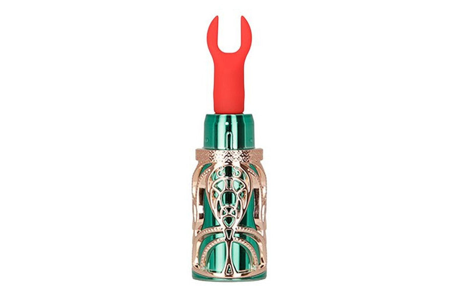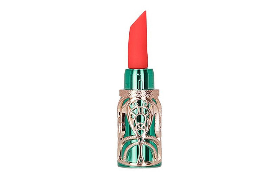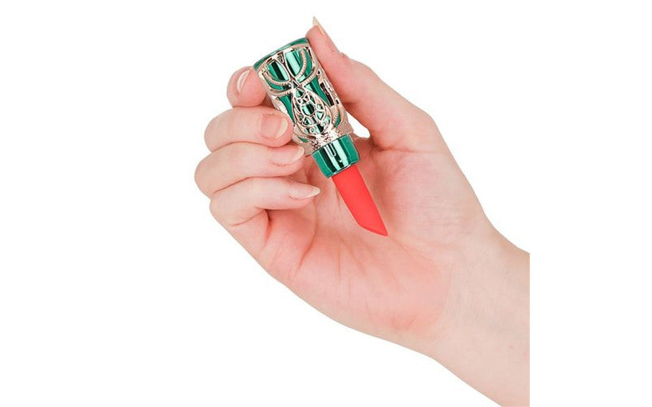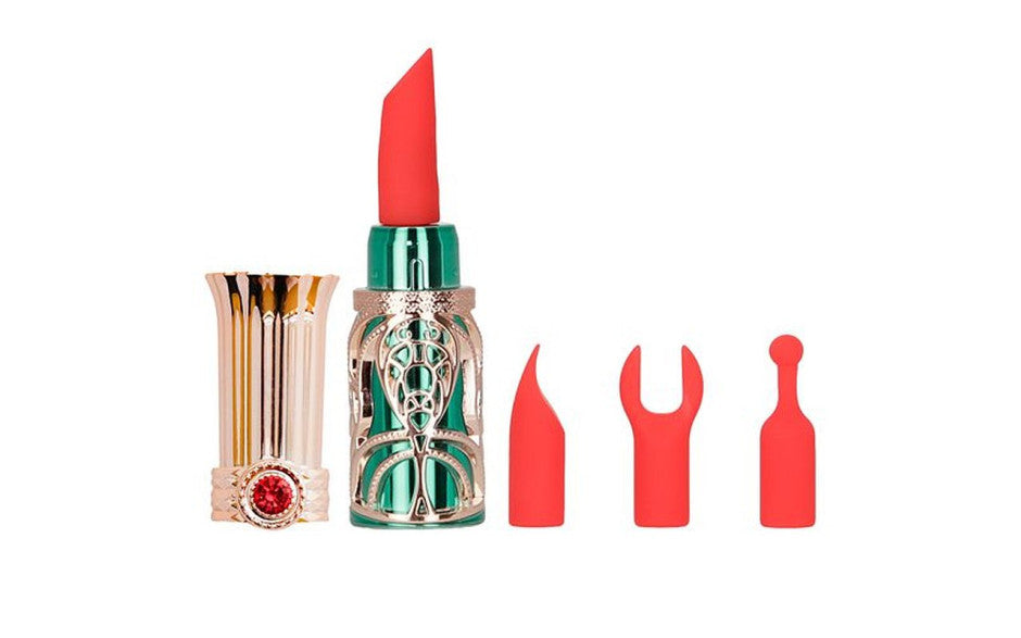 Discreet lipstick vibrator with four interchangeable tips for varied sensations. USB rechargeable with rose gold detailing.