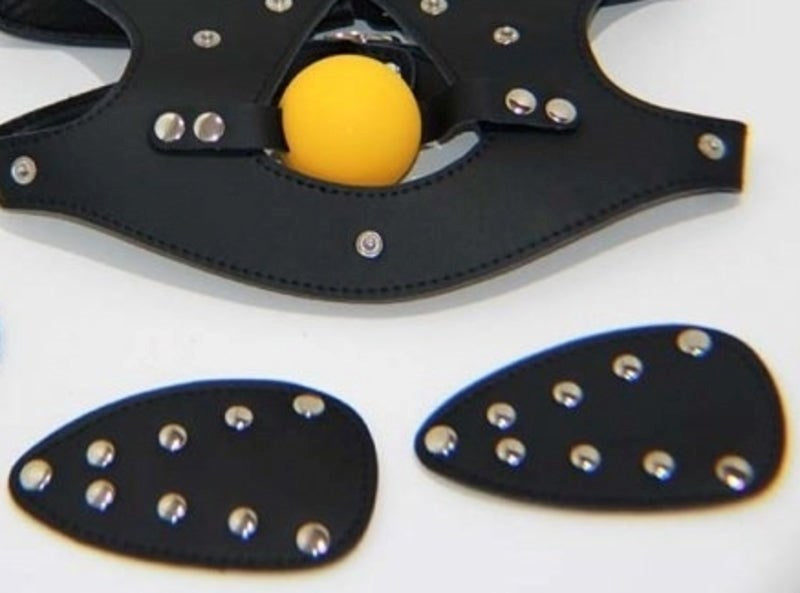 Three-in-one bondage mask with removable blindfold, ball gag, and mouth muffler. Adjustable straps for custom fit during sensory play.