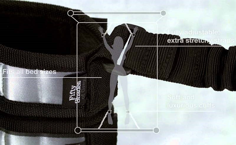 Elasticated bed spreader with faux-fur cuffs anchors under mattress. Fits any bed size with adjustable wrist and ankle restraints plus bonus blindfold.