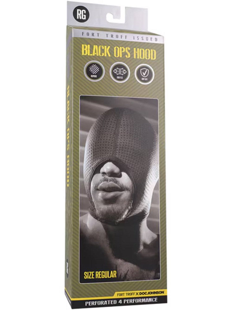 Perforated neoprene bondage hood with partial vision control. Extra-large mouth opening for submissive positioning. Breathable stretch material.