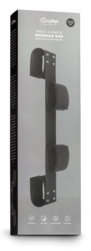 Four-point restraint bondage bar with padded cuffs for wrists and ankles. PU leather construction with velcro straps for adjustable fit.