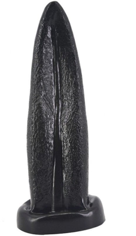 Silicone anal plug with unique tongue-shaped design for caressing stimulation. Flared base, 4.5 inches long, safe for extended wear.