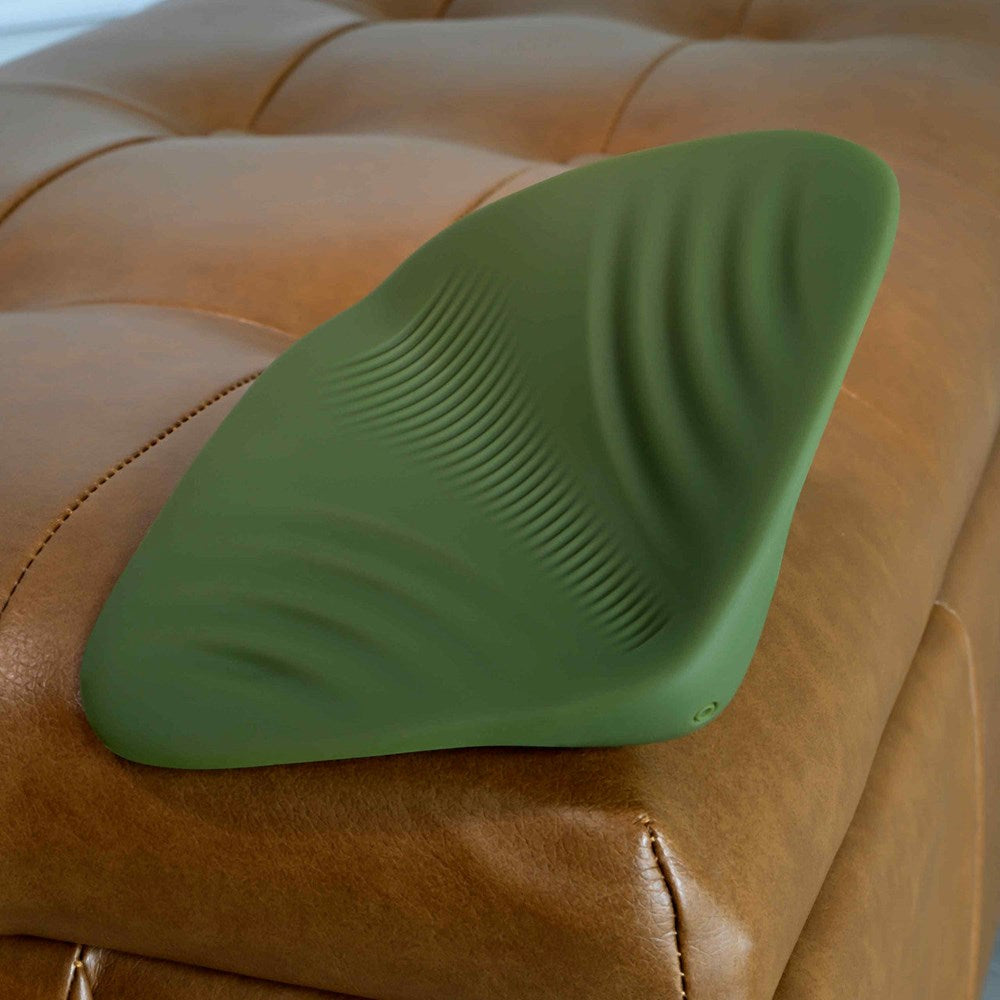 Dual-textured grinding pad with ten vibration patterns. USB rechargeable silicone toy for solo or partner play with unlimited positioning freedom.