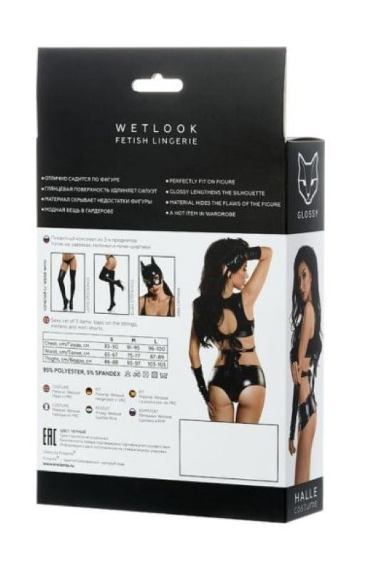 Three-piece wet look ensemble with glossy finish. Top, gloves, and mini-shorts with adjustable straps for custom fit.