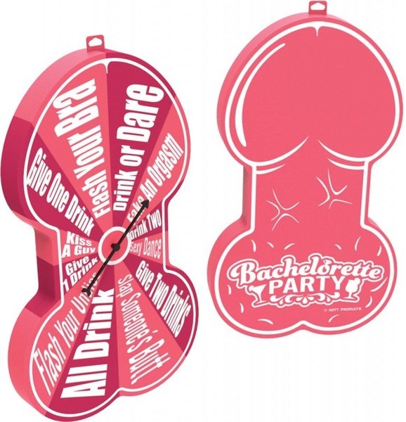18-inch foam pecker hand party accessory with built-in Drink or Dare spinner game. Lightweight novelty prop for bachelorette celebrations.