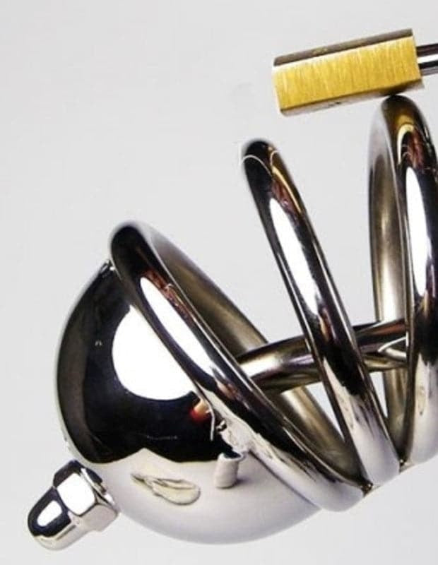 Steel chastity device with integrated pisser plug for dual control. Split-ring design with five sizes for secure lockup.