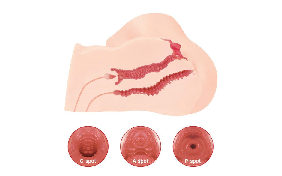 Dual-entry male stroker with realistic anatomy and textured internal channels. TPE construction for lifelike sensation and hands-free stability.