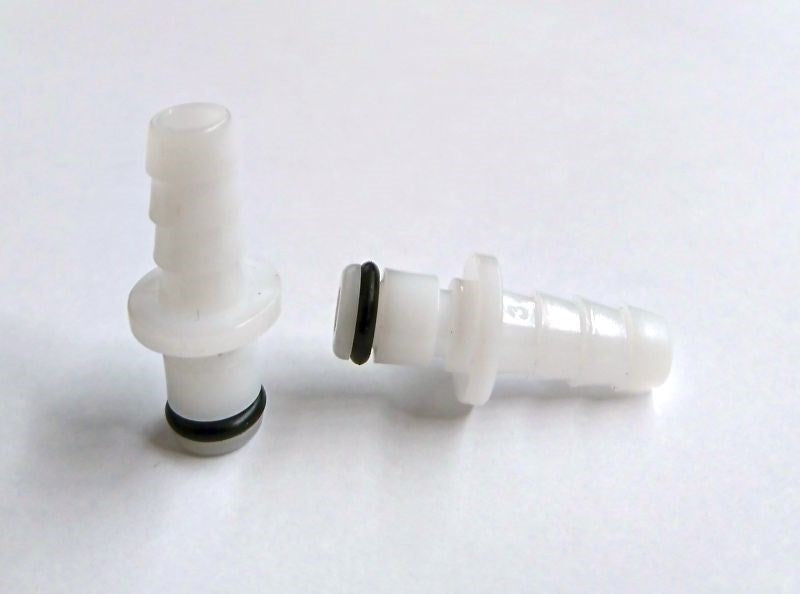 Barbed plastic connector for LA Pump systems. Creates airtight seals with vinyl tubing to maintain consistent vacuum pressure during pumping sessions.