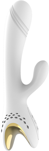Dual-motor rabbit massager with 20 vibration patterns. Silicone construction with independent shaft and ears control for customized stimulation.