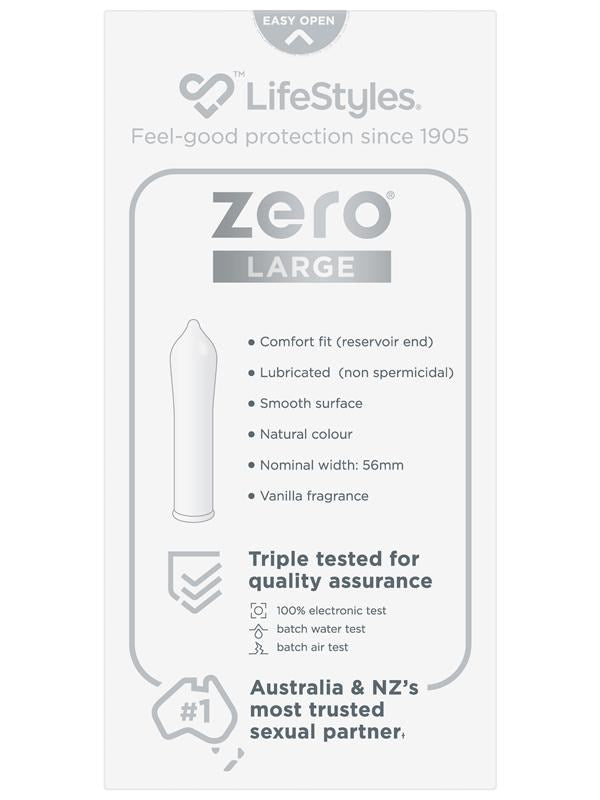 Natural latex condoms in large size with ultra-thin design. 10-pack with comfort fit reservoir end and non-spermicidal lubricant.
