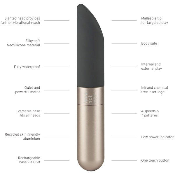Love Not War Amore clitoral bullet vibrator with NeoSilicone tip and recycled aluminum body. Waterproof with multiple vibration patterns.