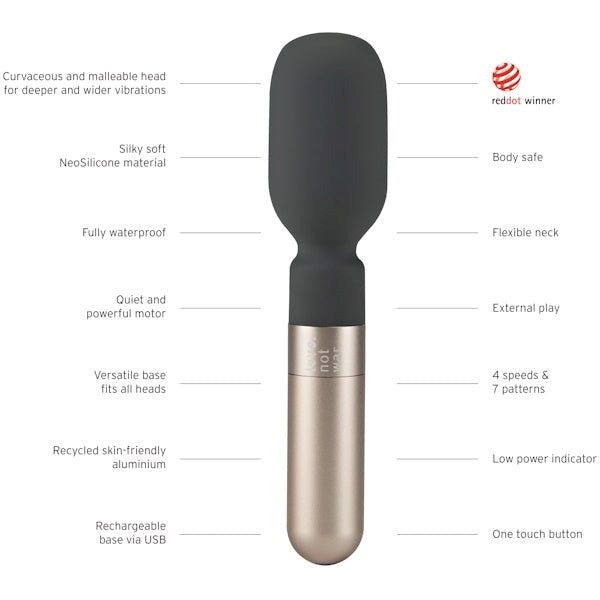 Flexible body wand vibrator with four intensity levels and seven patterns. NeoSilicone and recycled aluminum construction for therapeutic massage and pleasure.