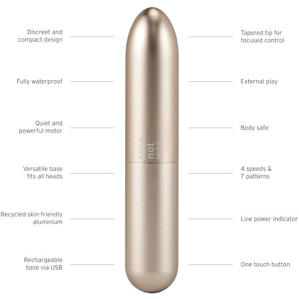 Temperature-responsive bullet vibrator with recycled aluminum body. Four intensity levels and seven vibration patterns for customizable stimulation.