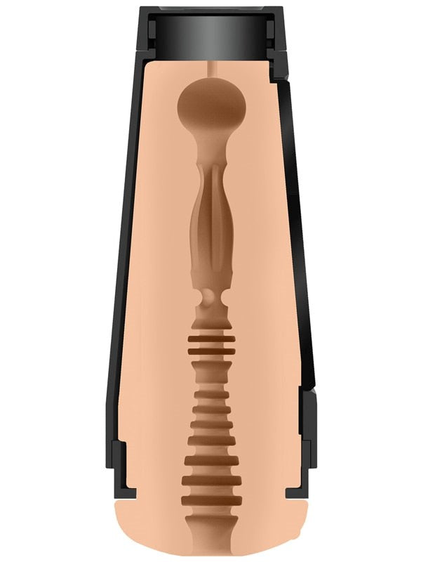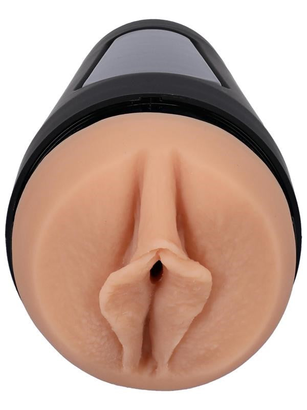 Doc Johnson Main Squeeze Stella Barey stroker with ULTRASKYN material. Squeeze plate and twist-cap suction control for customizable sensation.