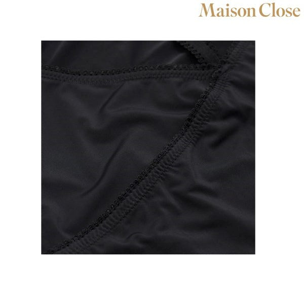 Black nylon-elastane bodysuit with open breast design and thong fit. Laser-cut detailing and adjustable straps for customizable fit.