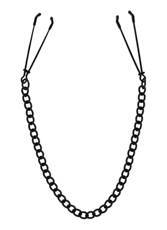 Adjustable tweezer-style nipple clamps with sliding ring control. Metal construction with vinyl coating and 18-inch weighted chain for precise sensory play.
