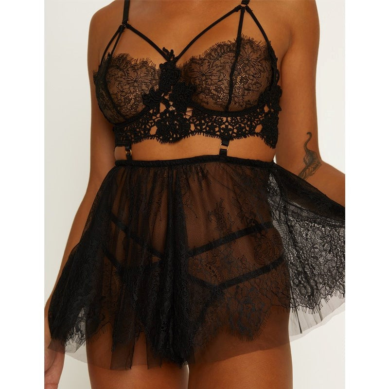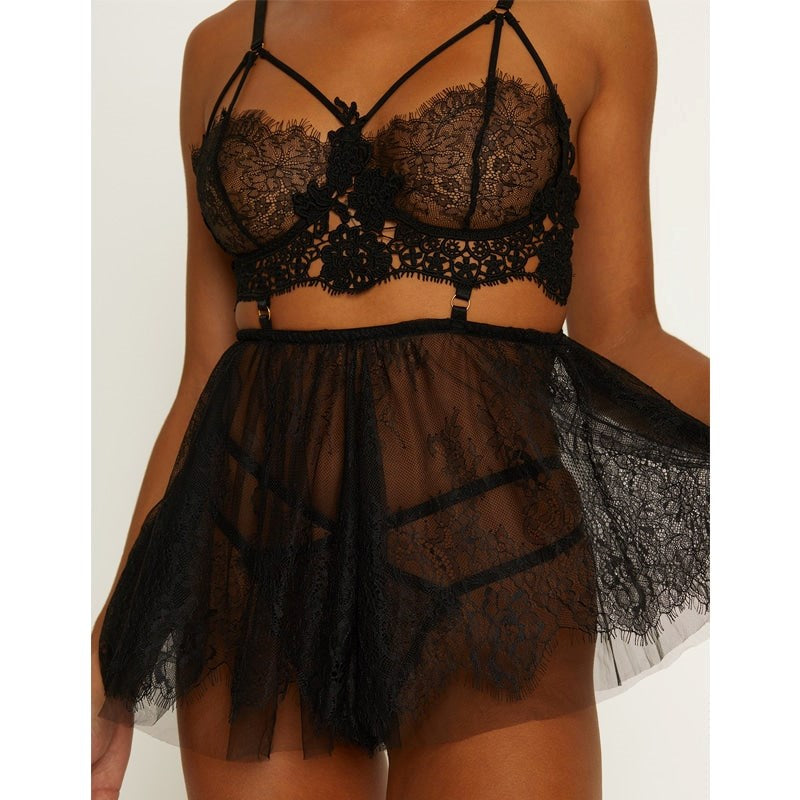 Black floral lace babydoll with soft mesh and gold hardware. Underwire-free design with matching G-string included.