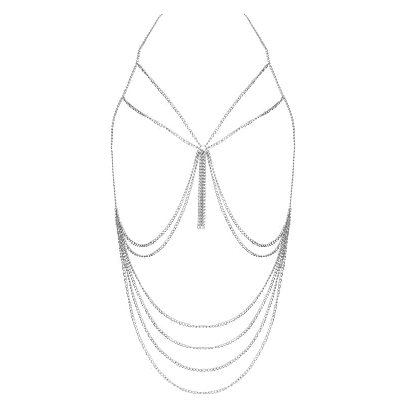 One Size chain harness with dramatic curb links and tassel detail. Statement piece for bold fashion and fetish wear.