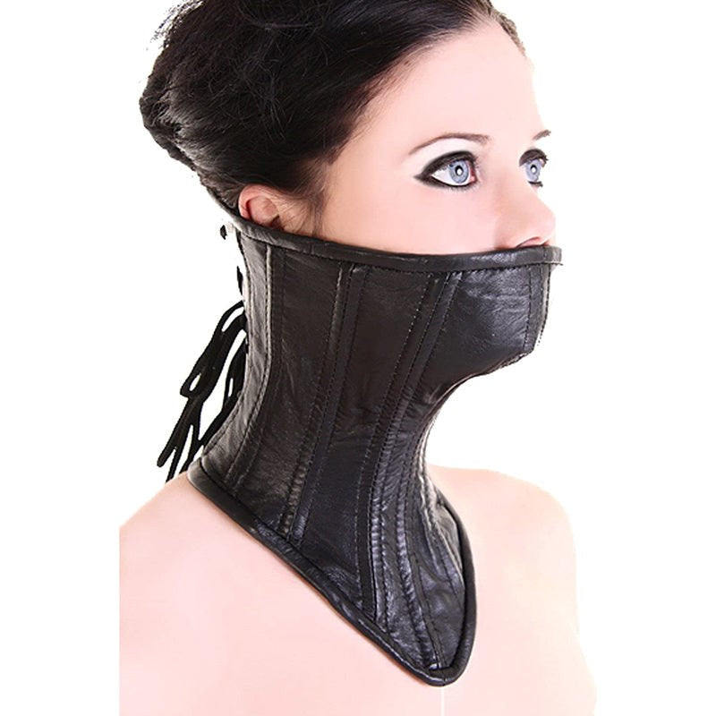 Soft lamb leather neck corset with adjustable lacing for customizable restriction. Elegant BDSM restraint combining luxury material with secure control.