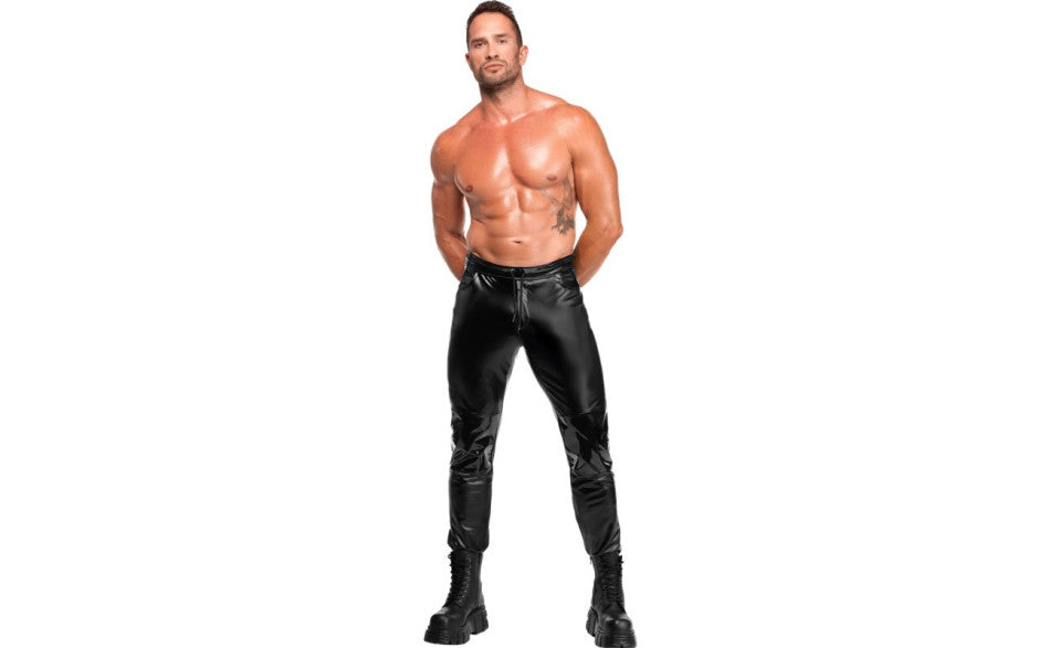 High-shine powerwetlook mens pants with bold PVC knee inserts. Second-skin stretch fit for club wear and statement looks.