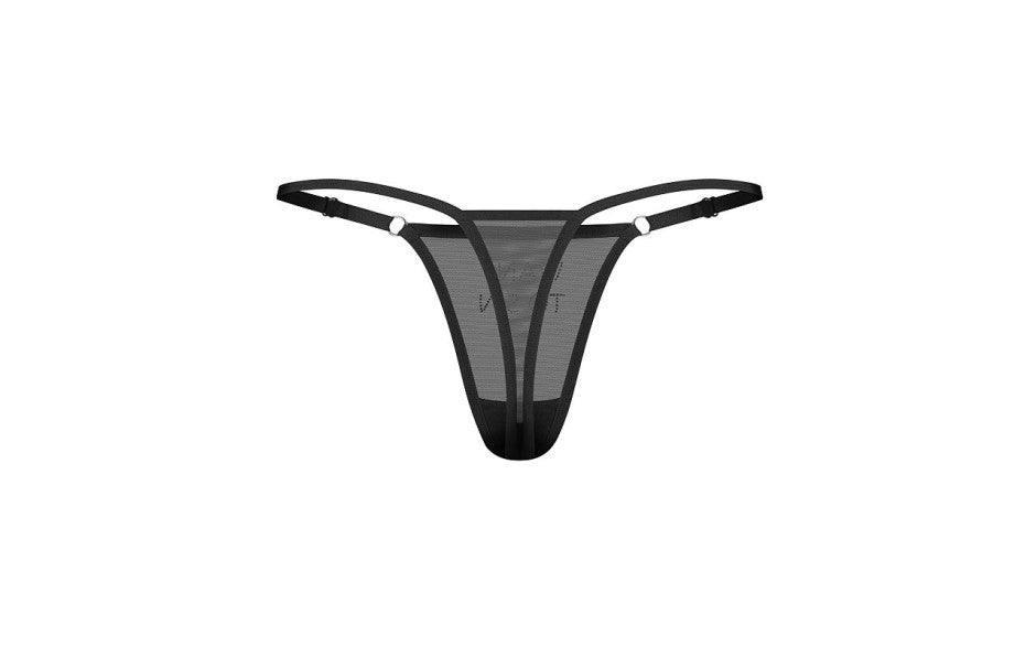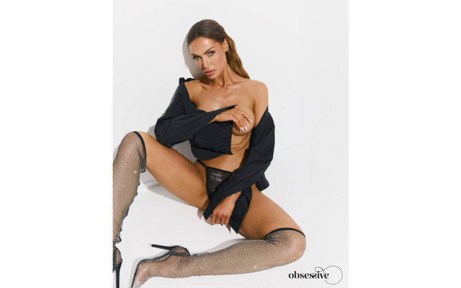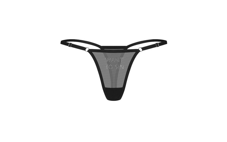 Sheer black mesh thong with rhinestone "WANT TO SIN" inscription and adjustable side straps for a bold, statement-making look.