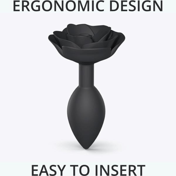 Flexible silicone anal plug with rose-inspired curves and tapered design. Three sizes available with secure flared base.
