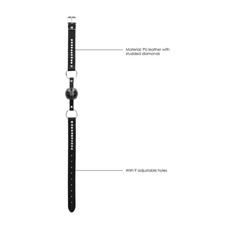 Shots Toys diamond studded ball gag with breathable faux leather design. Adjustable fit for BDSM restraint play with glamorous faux diamond studs.