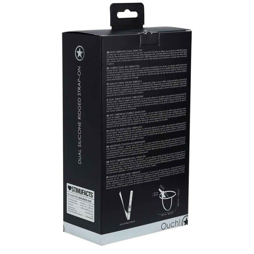 Dual-ended silicone strap-on with ridged texture for couples. Adjustable harness ensures secure fit during shared play.