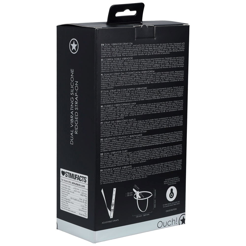 7-inch vibrating strap-on with dual motors and ridged texture. Rechargeable silicone harness for couples seeking intense shared stimulation.