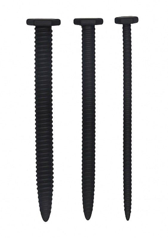 Medical-grade silicone plug set with spiral screw texture. Three progressive sizes from 0.9cm to 1.65cm for gradual training and controlled stimulation.