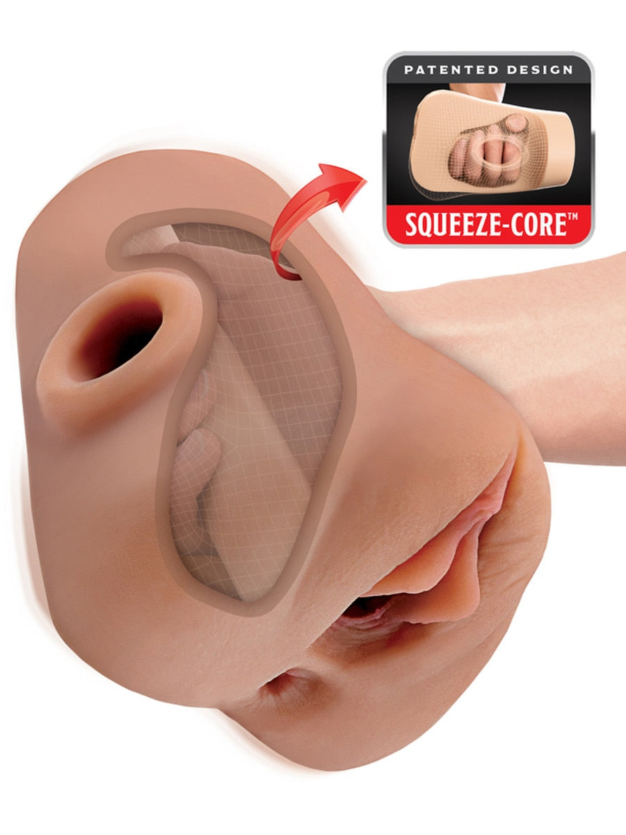 Dual-ended male stroker with patented Squeeze-Core hollow cavity for hand grip control. Includes rechargeable vibrating bullet with 10 modes.
