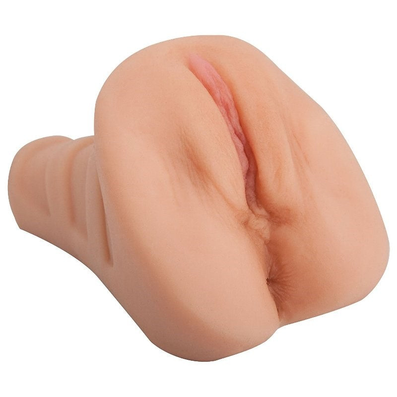 Dual-entry vibrating masturbator with realistic anatomical design. Two distinct sensations with customizable vibration intensity in one stroker.