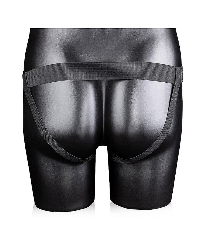 Shots Toys curved hollow strap-on with 8-inch length and textured surface for targeted stimulation. Includes adjustable harness and storage pouch.