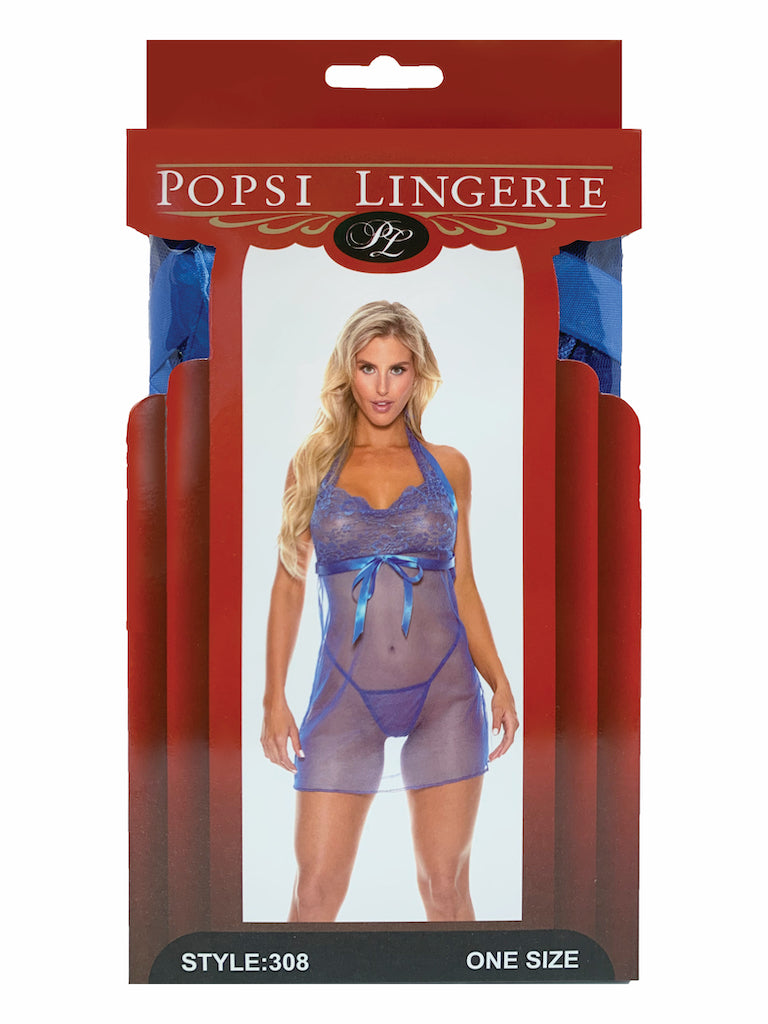 Sapphire lace and mesh babydoll with high neck halter design and thong back panty. One size fits most.