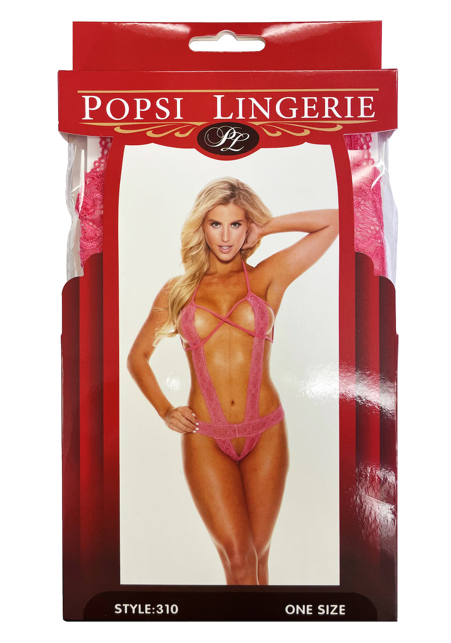 Strappy lace teddy bodysuit with criss-cross bust detailing and open cutouts. Halter support with cheeky back design for bold statement wear.