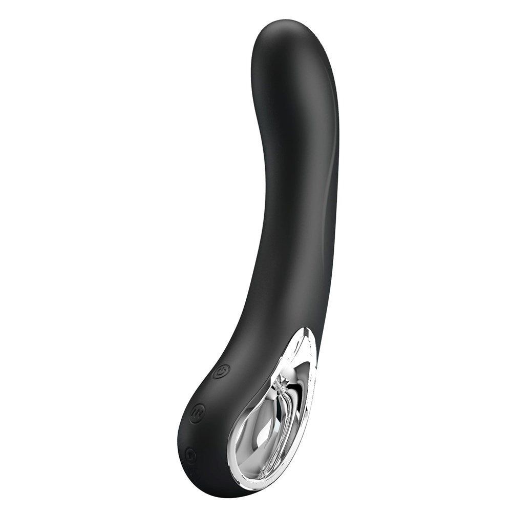 Angled G-spot vibrator with twelve vibration modes. Flexible silicone shaft with USB rechargeable battery for targeted internal stimulation.