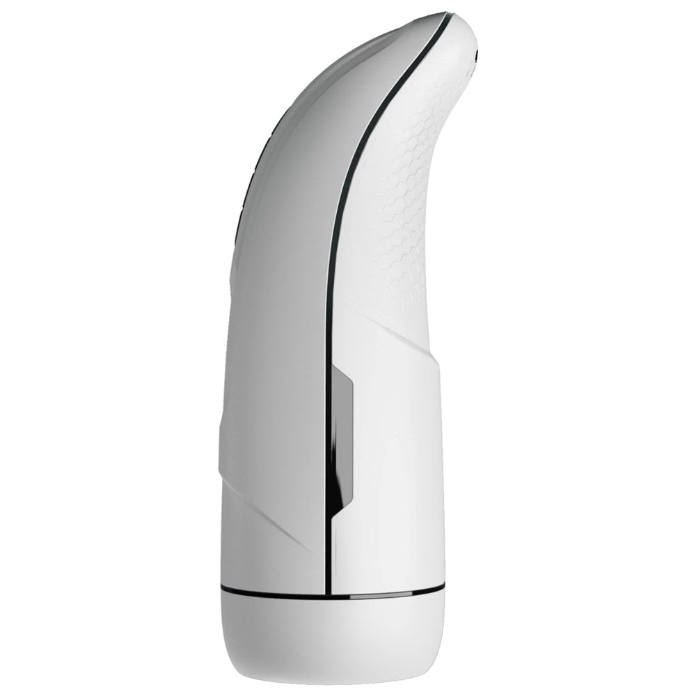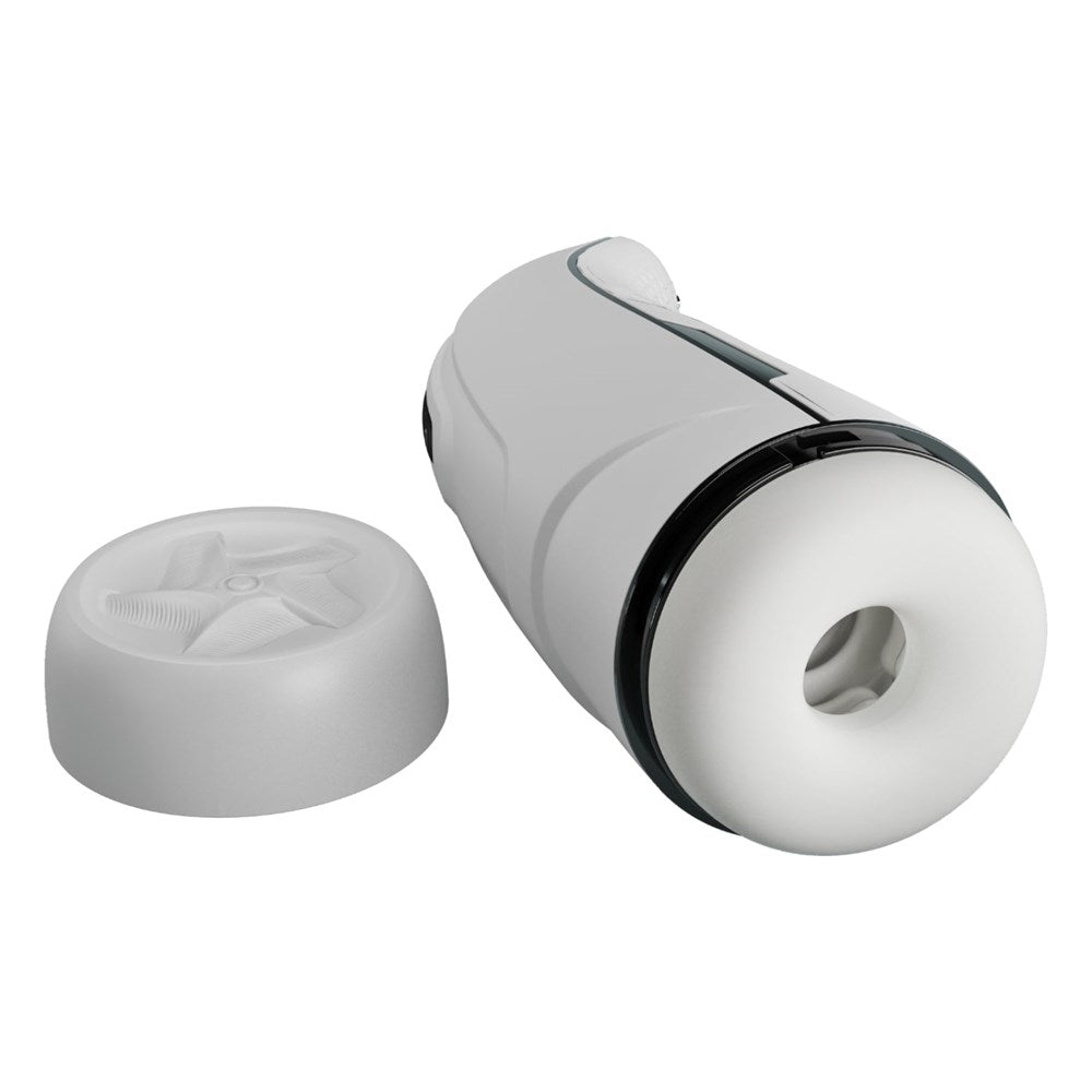 Rechargeable male masturbator with 12 vibration modes, 7 licking functions, and heating to 48°C. USB-rechargeable with memory recall.