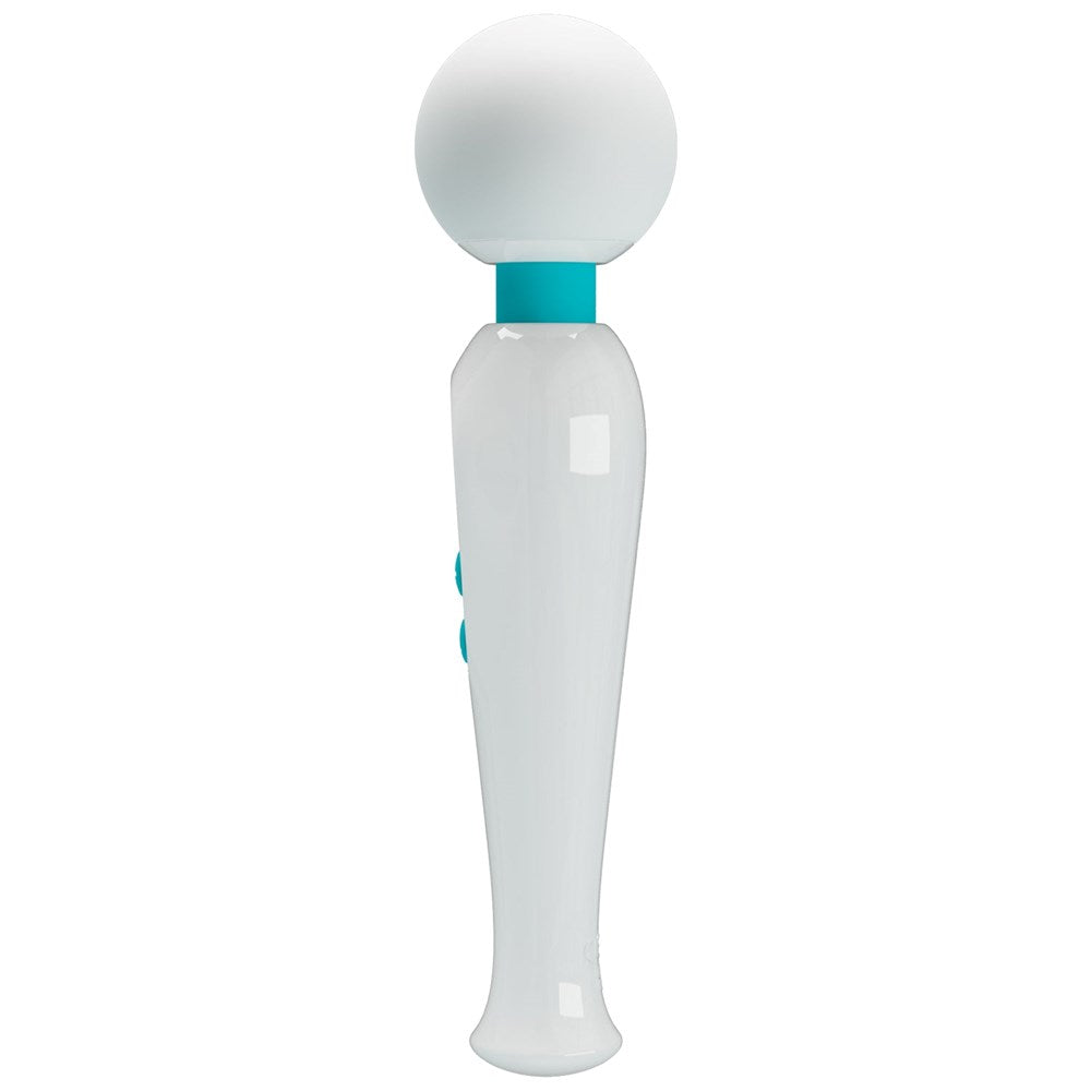 Vibrating body wand massager with 10 patterns and 9 intensity levels. Flexible silicone head with digital LCD controls for full-body massage.