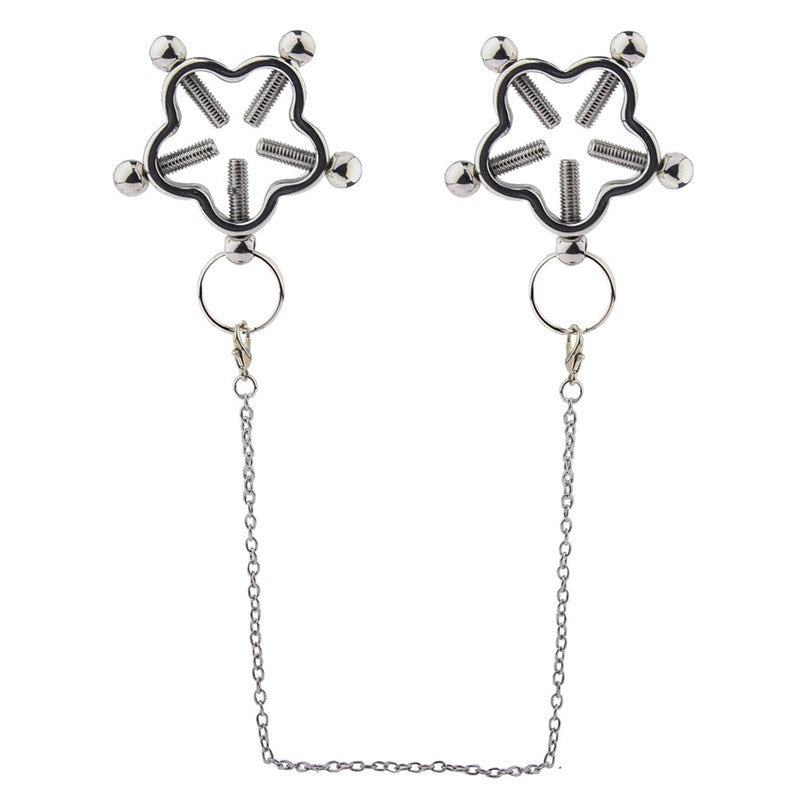 Stainless steel nipple clamps with twist-tightening mechanism for precise pressure control. Connecting chain included, fully waterproof.