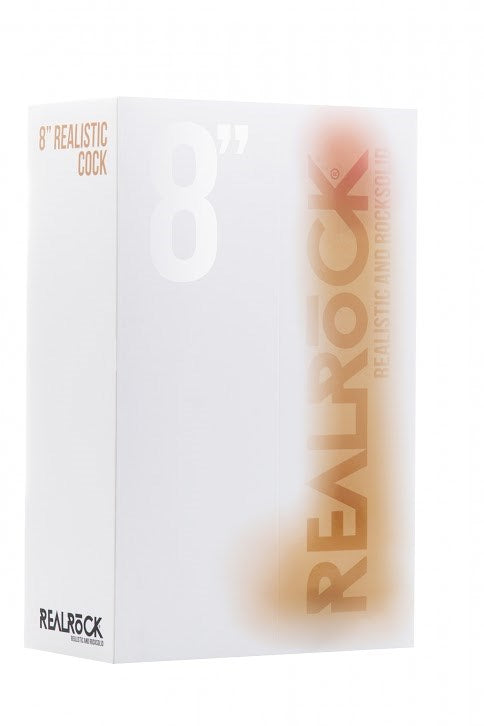 Realistic 8-inch dildo with anatomical scrotum base and strong suction cup for hands-free positioning during solo or partner play.